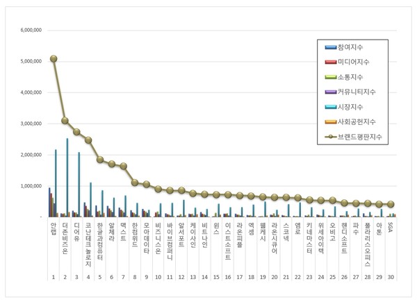 소프트웨어 상장기업 브랜드평판 1위를 기록한 안랩 브랜드는 참여지수 942,515 미디어지수 764,341 소통지수 631,796 커뮤니티지수 441,433 시장지수 2,170,384 사회공헌지수 136,386이 되면서 브랜드평판지수 5,086,854로 분석됐다. 지난 1월 브랜드평판지수 3,328,532와 비교해보면 52.83% 상승했다.