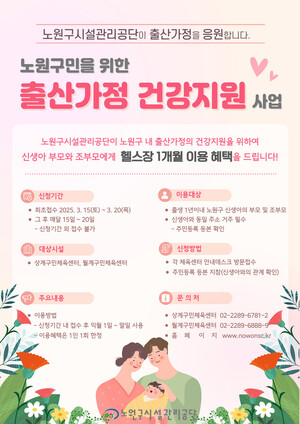 [이넷뉴스] 노원구시설관리공단(이사장 김주성)은 저출산 시대 출산 가정의 건강한 육아 환경 조성과 노원구민의 건강 지원을 위해 상계구민체육센터와 월계구민체육센터의 헬스장을 1개월간 무료로 이용할 수 있는 ‘출산가정 건강지원 사업’을 진행한다고 밝혔다.이번 사업은 출생 1년 이내의 신생아와 함께 거주하는 부모와 조부모를 대상으로 하며, 주민등록등본을 지참해 매달 15일~20일 사이에 방문 접수하면 다음 달 1개월 동안 헬스장을 무료로 이용할 수 있다. 첫 접수 기간은 2025년 3월 15일부터 20일까지며, 기간 내에 상계구민체육센터