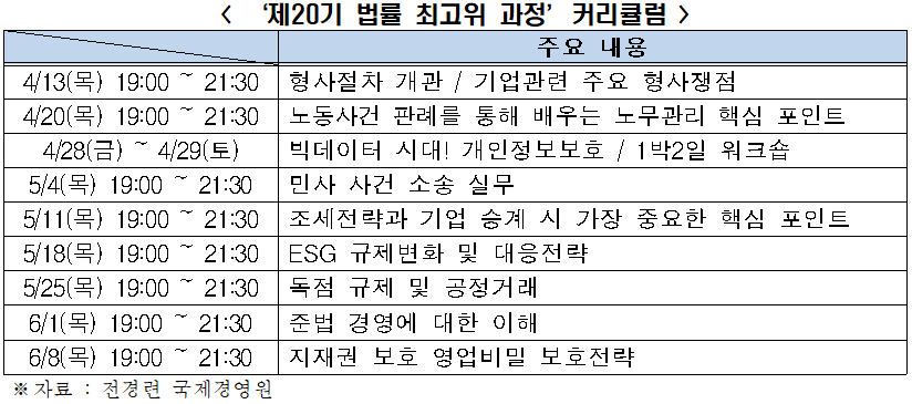 주요 내용은 ▲ 민‧형사 소송절차 및 실무 ▲ 노동사건 판례 및 노무관리 ▲ 개인정보 보호 ▲ 기업승계 및 조세전략 ▲ ESG 규제 대응 ▲ 독점 규제 및 공정거래 ▲ 지식 재산권 보호 전략 등 경영진이 놓치지 말아야 할 법률 이슈를 중심으로 구성되었다.