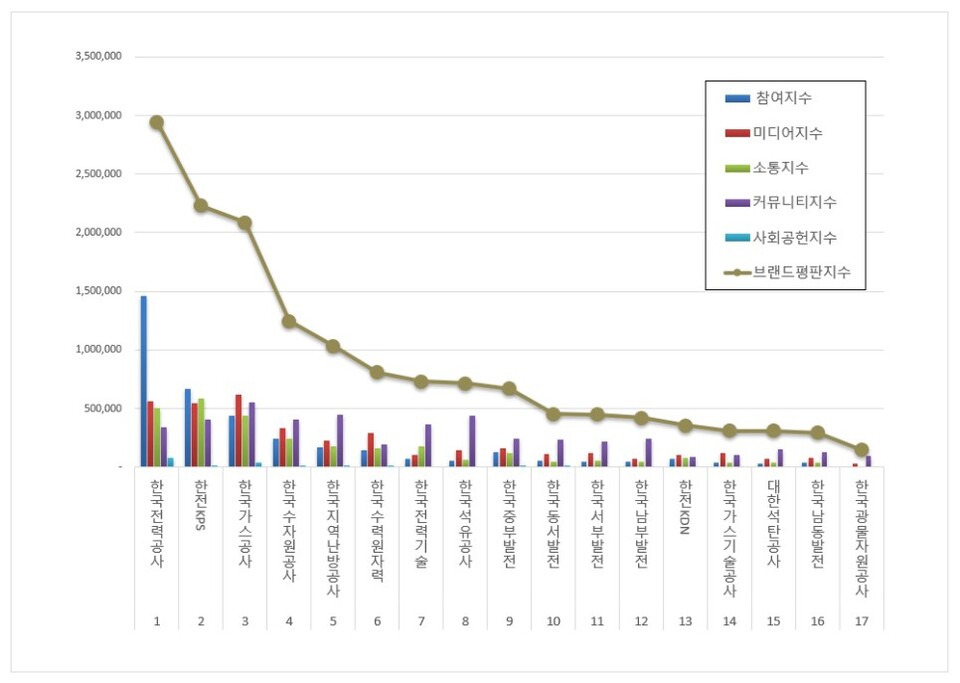 1위, 한국전력공사 브랜드는 참여지수 1,462,377 미디어지수 559,118 소통지수 503,481 커뮤니티지수 340,689 사회공헌지수 78,779가 되면서 브랜드평판지수 2,944,445로 분석됐다. 지난 2월 브랜드평판지수 4,655,300과 비교해보면 36.75% 하락했다.