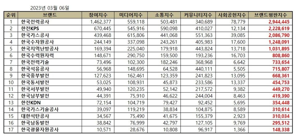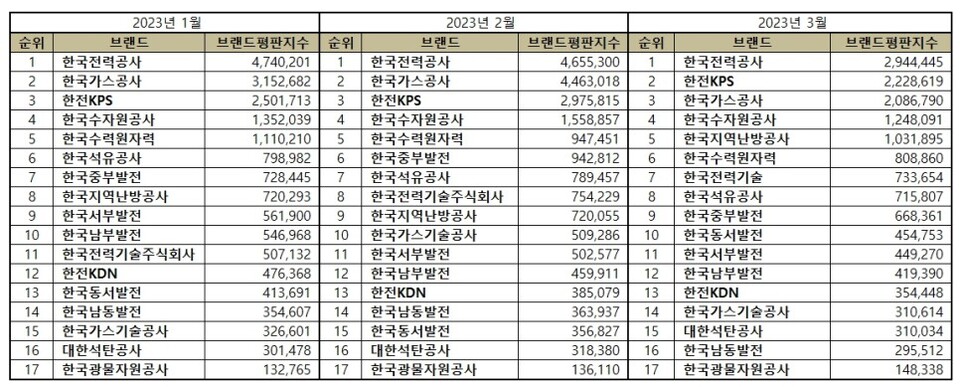 2023년 3월 에너지 공기업 브랜드평판 순위는 한국전력공사, 한전KPS, 한국가스공사, 한국수자원공사, 한국지역난방공사, 한국수력원자력, 한국전력기술, 한국석유공사, 한국중부발전, 한국동서발전, 한국서부발전, 한국남부발전, 한전KDN, 한국가스기술공사, 대한석탄공사, 한국남동발전, 한국광물자원공사 순으로 분석됐다.