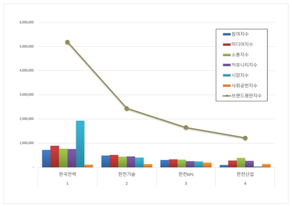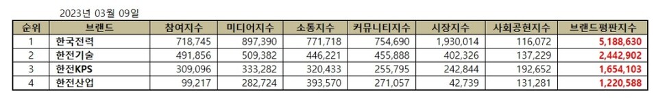 1위, 한국전력 브랜드는 참여지수 718,744 미디어지수 897,390 소통지수 771,718 커뮤니티지수 754,690 시장지수 1,930,014 사회공헌지수 116,072가 되면서 브랜드평판지수 5,188,630으로 분석됐다. 지난 2월 브랜드평판지수 6,126,657과 비교해보면 15.31% 하락했다.