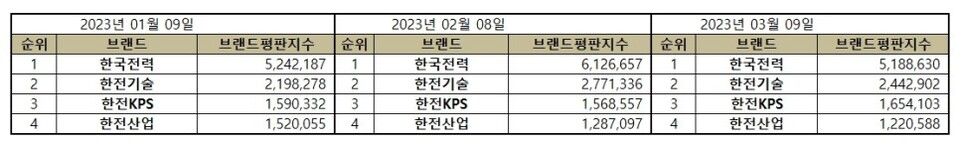 2023년 3월 전기 유틸리티 상장기업 브랜드평판 순위는 한국전력, 한전기술, 한전KPS, 한전산업 순으로 분석됐다.