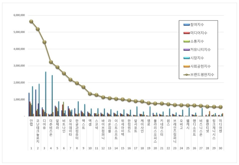 소프트웨어 상장기업 브랜드평판 1위를 기록한 안랩 브랜드는 참여지수 1,398,705 미디어지수 873,783 소통지수 771,526 커뮤니티지수 668,329 시장지수 1,780,310 사회공헌지수 152,125가 되면서 브랜드평판지수 5,644,778로 분석됐다. 지난 2월 브랜드평판지수 5,086,854와 비교해보면 10.97% 상승했다.