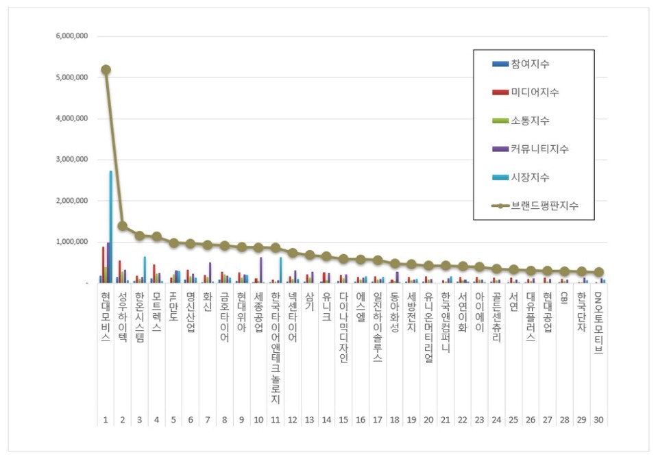 자동차부품 상장기업 브랜드평판 1위를 기록한 현대모비스 브랜드는 참여지수 180,794 미디어지수 898,155 소통지수 389,164 커뮤니티지수 991,551 시장지수 2,736,062가 되면서 브랜드평판지수 5,195,726으로 분석됐다. 지난 2월 브랜드평판지수 4,978,423과 비교해보면 4.36% 상승했다.