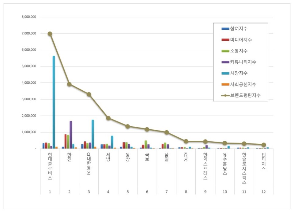 2위, 한진 브랜드는 참여지수 125,570 미디어지수 882,375 소통지수 843,130 커뮤니티지수 1,695,699 시장지수 290,521 사회공헌지수 86,747이 되면서 브랜드평판지수 3,924,042로 분석됐다. 지난 2월 브랜드평판지수 3,826,998과 비교해보면 2.54% 상승했다.
