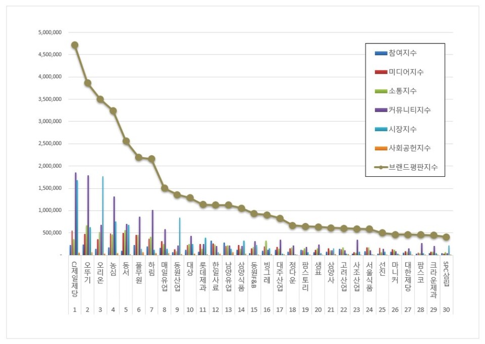 식품 상장기업 브랜드평판 1위를 기록한 CJ제일제당 브랜드는 참여지수 225,589 미디어지수 546,428 소통지수 353,121 커뮤니티지수 1,853,590 시장지수 1,685,459 사회공헌지수 56,665가 되면서 브랜드평판지수 4,720,853으로 분석됐다. 지난 2월 브랜드평판지수 4,532,535와 비교해보면 4.15% 상승했다.
