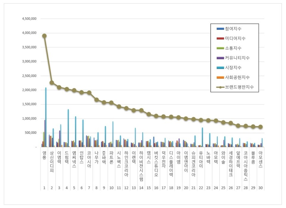 2위, 상신이디피 브랜드는 참여지수 439,952 미디어지수 396,615 소통지수 392,809 커뮤니티지수 323,433 시장지수 657,075 사회공헌지수 56,587이 되면서 브랜드평판지수 2,266,470으로 분석됐다. 지난 2월 브랜드평판지수 956,849와 비교해보면 136.87% 상승했다.