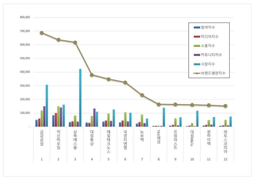 건축제품 상장기업 브랜드평판 1위를 기록한 금강공업 브랜드는 참여지수 49,779 미디어지수 60,673 소통지수 119,097 커뮤니티지수 150,721 시장지수 307,332가 되면서 브랜드평판지수 687,602로 분석됐다. 지난 2월 브랜드평판지수 753,883과 비교해보면 8.79% 하락했다.