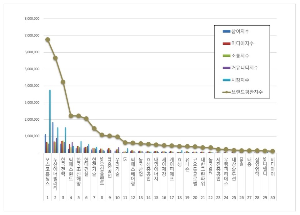 1위, 포스코홀딩스 브랜드는 참여지수 1,137,426 미디어지수 652,010 소통지수 640,998 커뮤니티지수 572,500 시장지수 3,764,987이 되면서 브랜드평판지수 6,767,921로 분석됐다. 지난 2월 브랜드평판지수 6,300,371과 비교해보면 7.42% 상승했다.