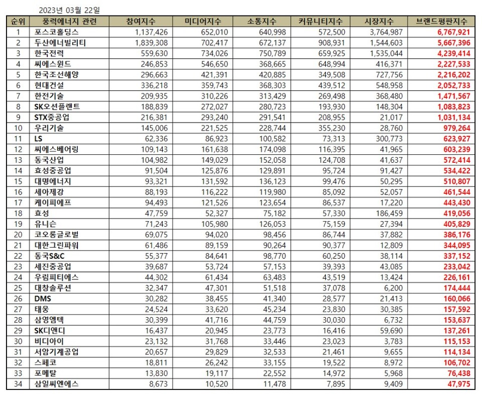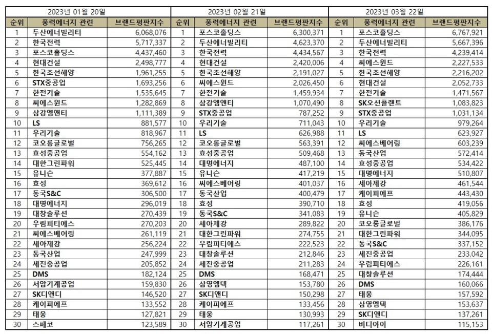 풍력에너지 관련 상장기업 브랜드평판 2023년 3월 빅데이터 분석 30위 순위는 포스코홀딩스, 두산에너빌리티, 한국전력, 씨에스윈드, 한국조선해양, 현대건설, 한전기술, SK오션플랜트, STX중공업, 우리기술, LS, 씨에스베어링, 동국산업, 효성중공업, 대명에너지, 세아제강, 케이피에프, 효성, 유니슨, 코오롱글로벌, 대한그린파워, 동국S&C, 세진중공업, 우림피티에스, 대창솔루션, DMS, 태웅, 삼영엠텍, SK디앤디, 비디아이 순이었다.