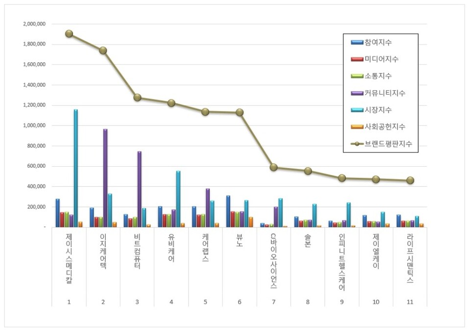2위, 이지케어텍 브랜드는 참여지수 192,559 미디어지수 101,355 소통지수 99,118 커뮤니티지수 966,678 시장지수 329,255 사회공헌지수 49,902가 되면서 브랜드평판지수 1,738,866으로 분석됐다. 지난 2월 브랜드평판지수 1,733,685와 비교해보면 0.30% 상승했다.