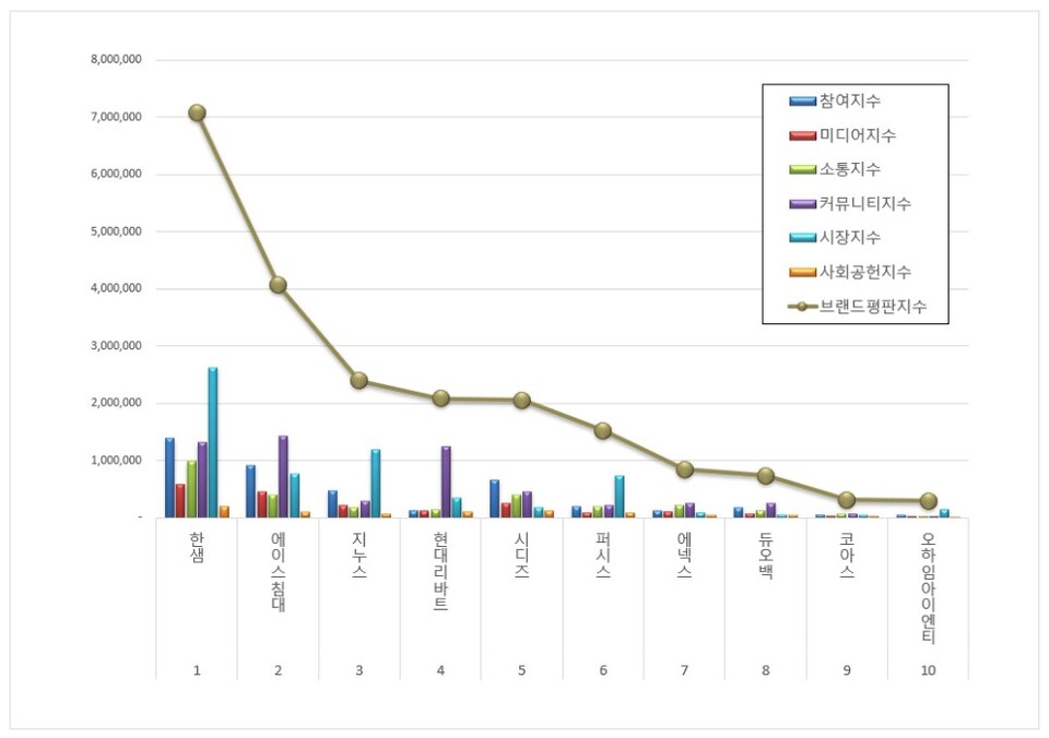 가구 상장기업 브랜드평판 1위를 기록한 한샘 브랜드는 참여지수 1,384,845 미디어지수 590,104 소통지수 979,622 커뮤니티지수 1,312,760 시장지수 2,620,636 사회공헌지수 198,121이 되면서 브랜드평판지수 7,086,088로 분석됐다. 지난 2월 브랜드평판지수 7,319,385와 비교해보면 3.19% 하락했다.