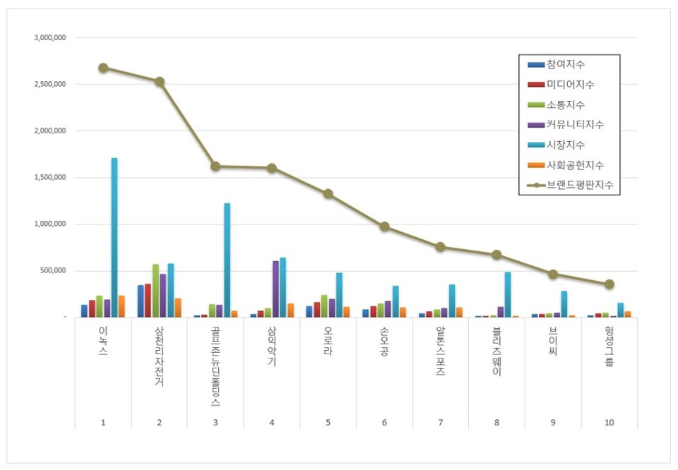 레저장비 상장기업 브랜드평판 1위를 기록한 이녹스 브랜드는 참여지수 133,528 미디어지수 182,753 소통지수 233,893 커뮤니티지수 190,189 시장지수 1,708,290 사회공헌지수 230,470이 되면서 브랜드평판지수 2,679,124로 분석됐다. 지난 12월 브랜드평판지수 1,881,967과 비교해보면 42.36% 상승했다.