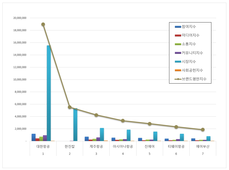 항공사 상장기업 브랜드평판 분석은 참여지수, 미디어지수, 소통지수, 커뮤니티지수, 시장지수, 사회공헌지수로 구분하여 브랜드평판지수를 산출했다.