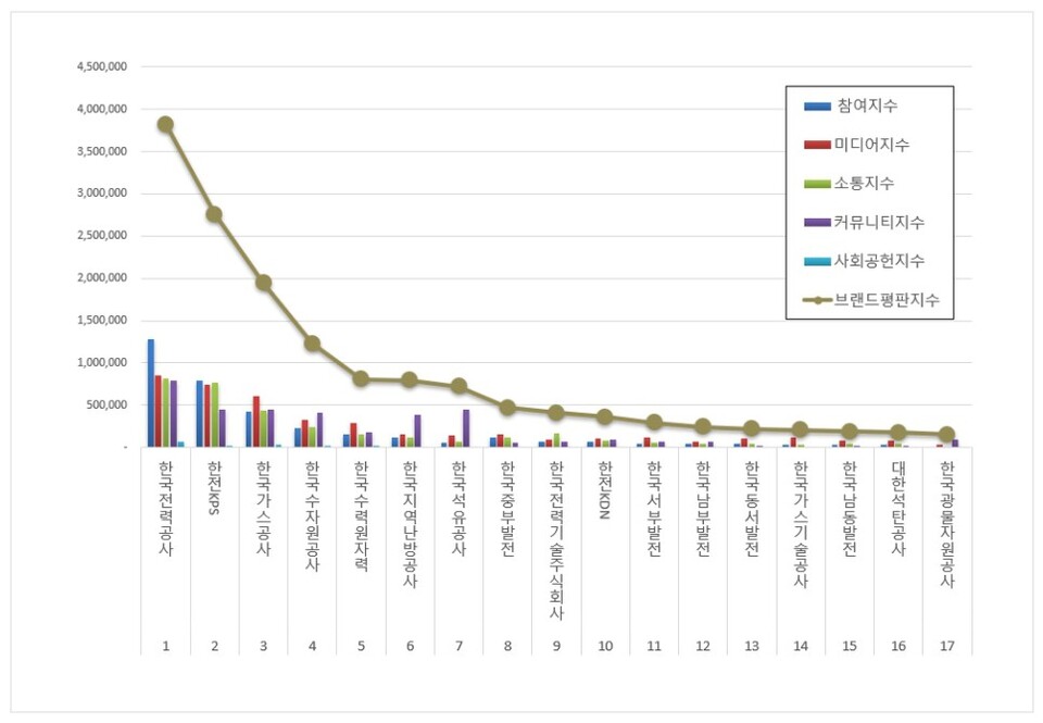1위, 한국전력공사 브랜드는 참여지수 1,276,958 미디어지수 853,540 소통지수 821,124 커뮤니티지수 793,332 사회공헌지수 69,356이 되면서 브랜드평판지수 3,814,309로 분석됐다. 지난 3월 브랜드평판지수 2,944,445와 비교해보면 29.54% 상승했다.