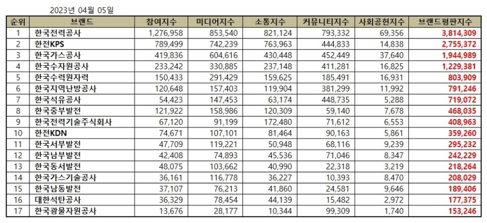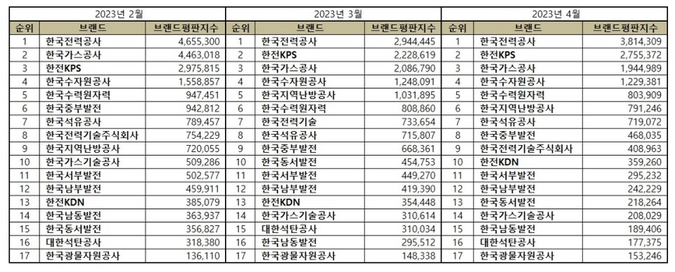 2023년 4월 에너지 공기업 브랜드평판 순위는 한국전력공사, 한전KPS, 한국가스공사, 한국수자원공사, 한국수력원자력, 한국지역난방공사, 한국석유공사, 한국중부발전, 한국전력기술주식회사, 한전KDN, 한국서부발전, 한국남부발전, 한국동서발전, 한국가스기술공사, 한국남동발전, 대한석탄공사, 한국광물자원공사 순으로 분석됐다.