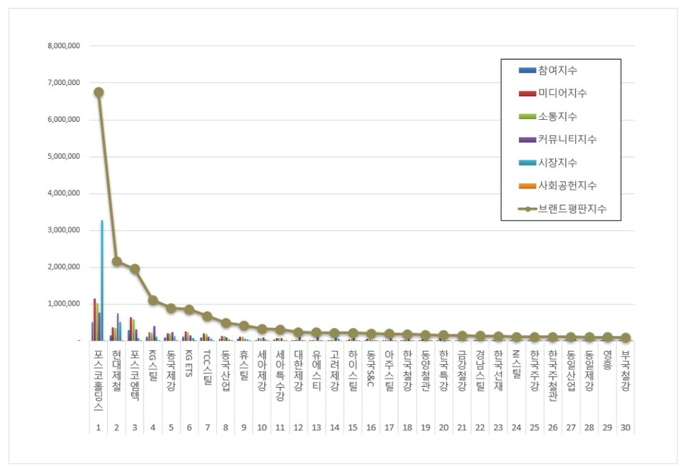 철강 상장기업 브랜드평판 1위를 기록한 포스코홀딩스 브랜드는 참여지수 519,548 미디어지수 1,145,113 소통지수 1,023,659 커뮤니티지수 770,889 시장지수 3,272,725 사회공헌지수 27,402가 되면서 브랜드평판지수 6,759,335로 분석됐다. 지난 3월 브랜드평판지수 5,861,571과 비교해보면 15.32% 상승했다.