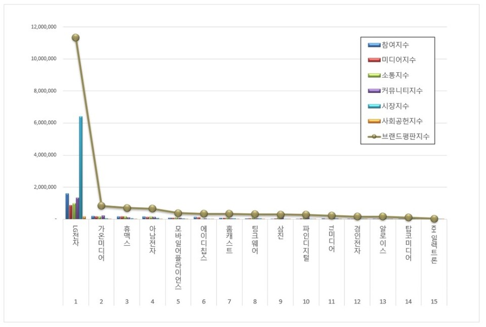 전자제품 상장기업 브랜드평판 1위를 기록한 LG전자 브랜드는 참여지수 1,601,320 미디어지수 853,645 소통지수 970,046 커뮤니티지수 1,324,954 시장지수 6,419,174 사회공헌지수 161,939가 되면서 브랜드평판지수 11,331,079로 분석됐다. 지난 3월 브랜드평판지수 9,567,967과 비교해보면 18.43% 상승했다.