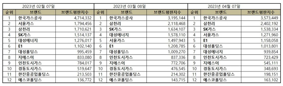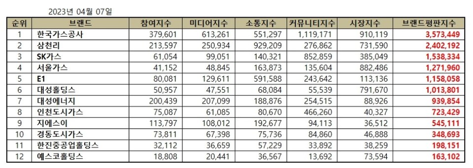 [이넷뉴스] 2023년 4월 가스 유틸리티 상장기업 브랜드평판이 공개됐다.