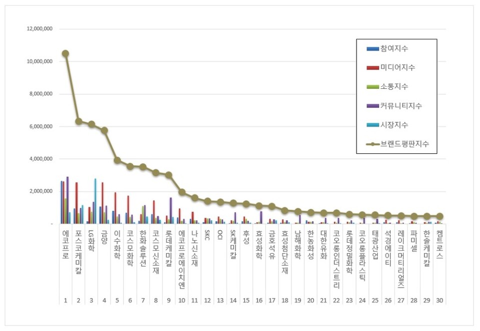 한국기업평판연구소 구창환 소장은 "화학 상장기업 브랜드평판 2023년 4월 브랜드 빅데이터 분석결과, 에코프로 ( 대표 송호준 ) 브랜드가 1위를 기록했다. 화학 상장기업 브랜드 카테고리를 분석해보니 브랜드소비 67.02% 상승, 브랜드이슈 39.62% 상승, 브랜드소통 24.54% 상승, 브랜드확산 6.69% 상승, 브랜드시장 13.73% 상승했다"라고 평판 분석했다.