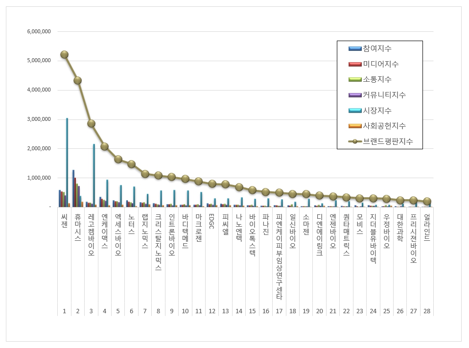 3위, 레고켐바이오 브랜드는 참여지수 178,458 미디어지수 157,862 소통지수 154,228 커뮤니티지수 120,096 시장지수 2,152,792 사회공헌지수 89,586이 되면서 브랜드평판지수 2,853,022로 분석됐다. 지난 3월 브랜드평판지수 3,030,558과 비교해보면 5.86% 하락했다.