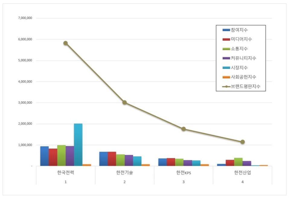 1위, 한국전력 브랜드는 참여지수 941,598 미디어지수 831,183 소통지수 992,881 커뮤니티지수 946,913 시장지수 2,019,823 사회공헌지수 94,968이 되면서 브랜드평판지수 5,827,365로 분석됐다. 지난 3월 브랜드평판지수 5,188,630과 비교해보면 12.31% 상승했다.