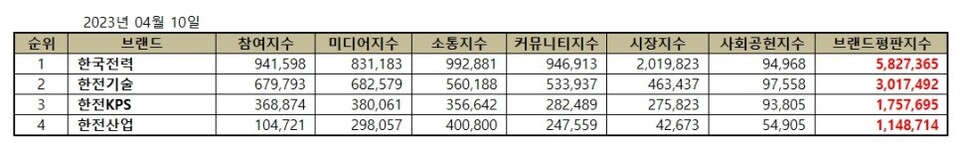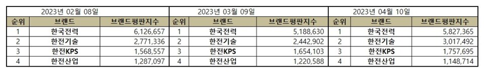 2023년 4월 전기 유틸리티 상장기업 브랜드평판 순위는 한국전력, 한전기술, 한전KPS, 한전산업 순으로 분석됐다.