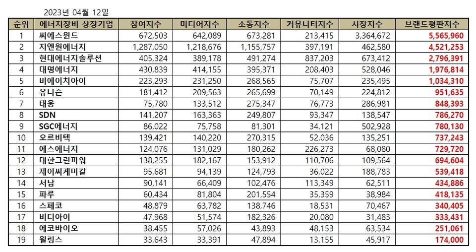 2023년 4월 에너지장비 상장기업 브랜드평판 빅데이터 분석 순위는 씨에스윈드, 지엔원에너지, 현대에너지솔루션, 대명에너지, 비에이치아이, 유니슨, 태웅, SDN, SGC에너지, 오르비텍, 에스에너지, 대한그린파워, 제이씨케미칼, 서남, 파루, 스페코, 비디아이, 에코바이오, 윌링스 순이었다.