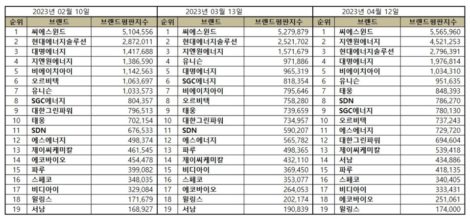 - [e브랜드평판] 씨에스윈드, 에너지장비 브랜드평판 1위···현대에너지솔루션·대한그린파워 뒤이어