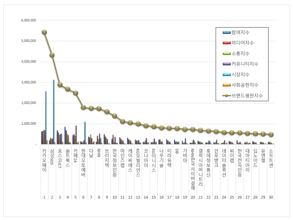 2위, 삼성SDS 브랜드는 참여지수 202,860 미디어지수 312,245 소통지수 269,830 커뮤니티지수 294,183 시장지수 3,123,429 사회공헌지수 113,500이 되면서 브랜드평판지수 4,316,048로 분석됐다. 지난 3월 브랜드평판지수 5,170,357과 비교해보면 16.52% 하락했다.