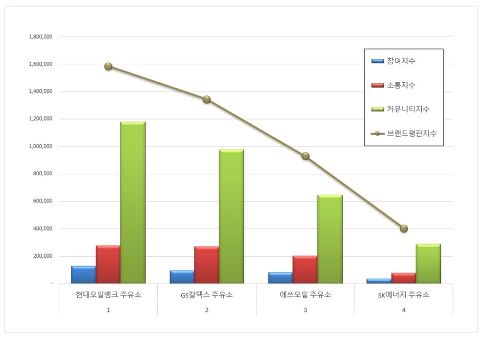 1위, HD현대오일뱅크 주유소 브랜드는 참여지수 128,449 소통지수 277,461 커뮤니티지수 1,177,591이 되면서 브랜드평판지수 1,583,502로 분석됐다. 지난 3월 브랜드평판지수 904,486과 비교해보면 75.07% 상승했다.