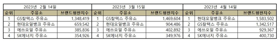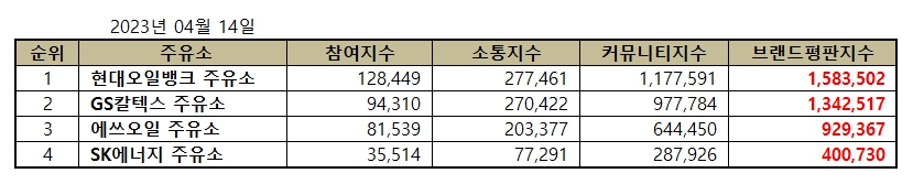 이넷뉴스와 한국기업평판연구소는 소비자들에게 사랑받는 주유소 브랜드에 대해 브랜드 빅데이터를 통한 평판조사를 하였다. 4개 주유소 브랜드평판 분석은 2023년 3월 14일부터 2023년 4월 14일까지의 주유소 브랜드 빅데이터 4,256,116개를 분석하여 소비자들의 브랜드 습관과 브랜드와 관계 분석을 통해 브랜드평판을 분석했다. 지난 3월 브랜드 빅데이터 3,126,958개와 비교하면 36.11% 증가했다.
