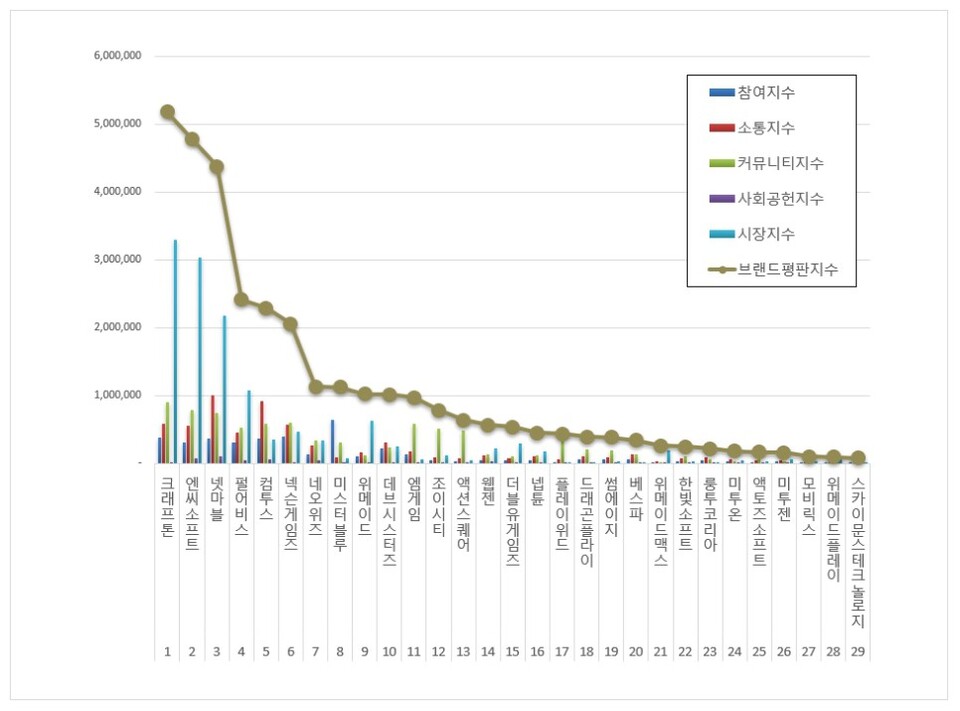 2위, 엔씨소프트 브랜드는 참여지수 314,099 소통지수 551,683 커뮤니티지수 792,498 사회공헌지수 79,803 시장지수 3,038,862가 되면서 브랜드평판지수 4,776,945로 분석됐다. 지난 3월 브랜드평판지수 5,631,008과 비교해보면 15.17% 하락했다.