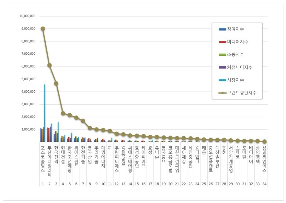 2위, 두산에너빌리티 브랜드는 참여지수 1,148,716 미디어지수 1,144,049 소통지수 1,107,329 커뮤니티지수 1,216,835 시장지수 1,479,232가 되면서 브랜드평판지수 6,096,161로 분석됐다. 지난 3월 브랜드평판지수 5,667,396과 비교해보면 7.57% 상승했다.