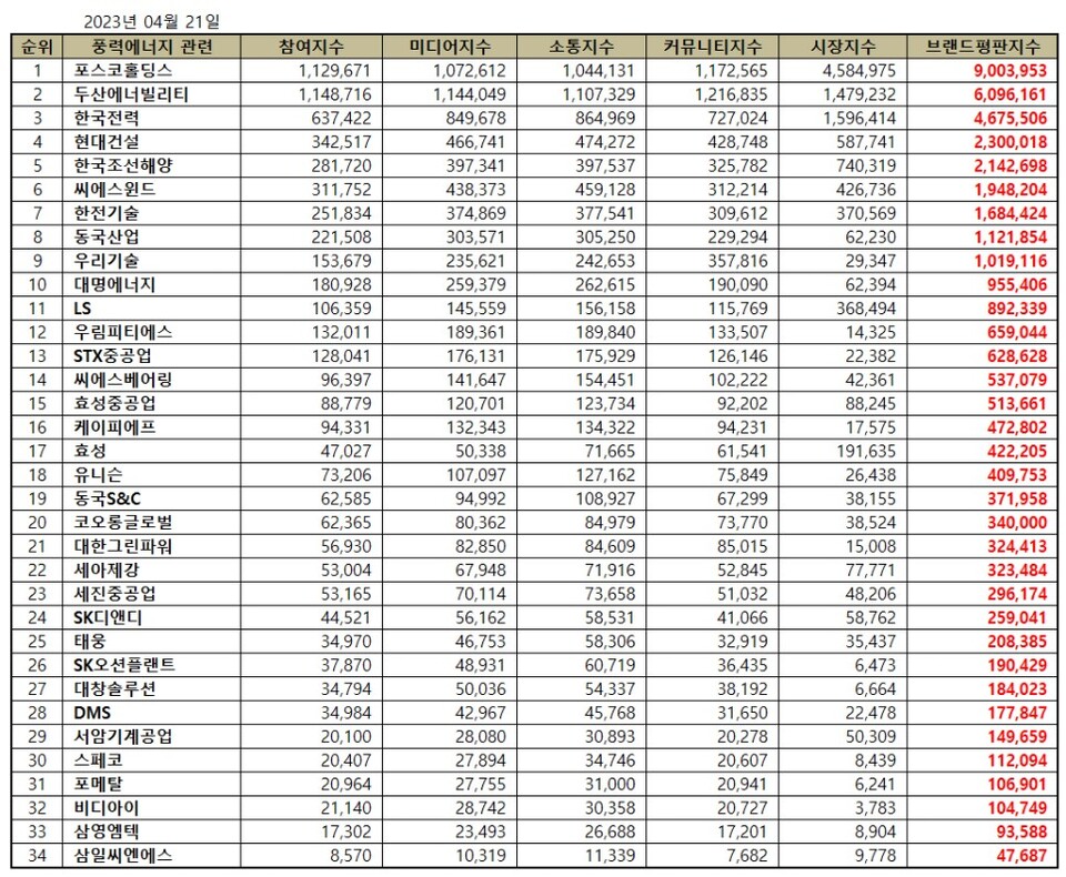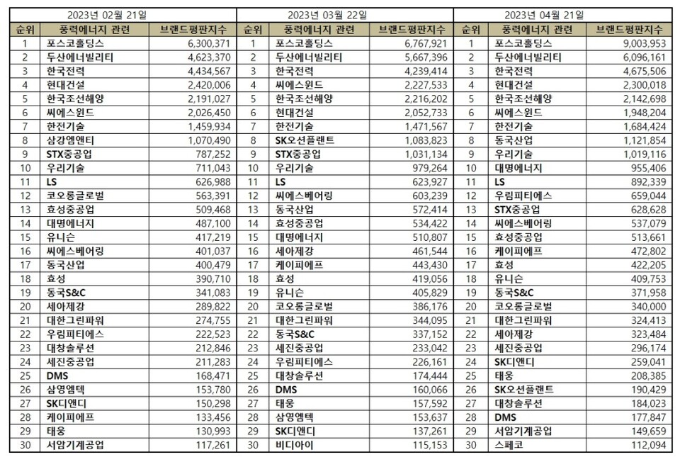 풍력에너지 관련 상장기업 브랜드평판 2023년 4월 빅데이터 분석 30위 순위는 포스코홀딩스, 두산에너빌리티, 한국전력, 현대건설, 한국조선해양, 씨에스윈드, 한전기술, 동국산업, 우리기술, 대명에너지, LS, 우림피티에스, STX중공업, 씨에스베어링, 효성중공업, 케이피에프, 효성, 유니슨, 동국S&C, 코오롱글로벌, 대한그린파워, 세아제강, 세진중공업, SK디앤디, 태웅, SK오션플랜트, 대창솔루션, DMS, 서암기계공업, 스페코 순이었다.