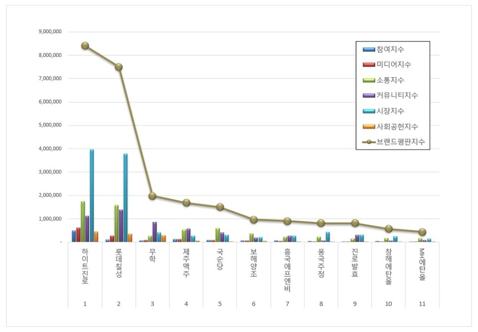 3위, 무학 브랜드는 참여지수 71,334 미디어지수 89,988 소통지수 279,089 커뮤니티지수 860,336 시장지수 401,187 사회공헌지수 282,234가 되면서 브랜드평판지수 1,984,168로 분석됐다. 지난 3월 브랜드평판지수 1,546,177과 비교해보면 28.33% 상승했다.