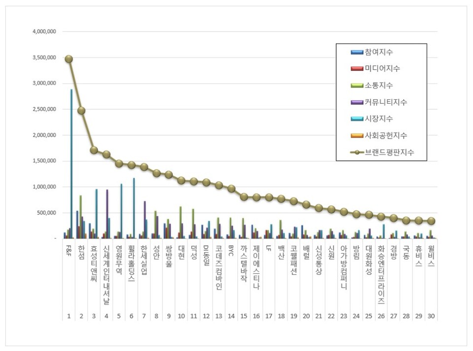 3위, 효성티앤씨 브랜드는 참여지수 298,284 미디어지수 132,006 소통지수 191,191 커뮤니티지수 96,170 시장지수 960,174 사회공헌지수 30,580이 되면서 브랜드평판지수 1,708,405로 분석됐다. 지난 3월 브랜드평판지수 1,838,189와 비교해보면 7.06% 하락했다.