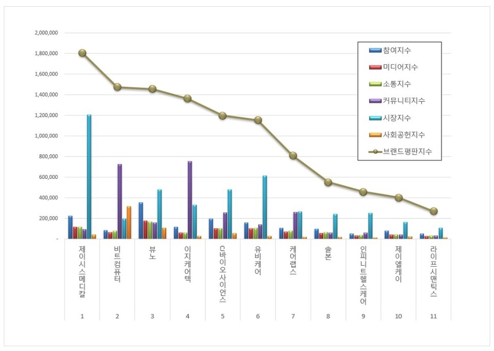건강관리기술 상장기업 브랜드평판 분석은 참여지수, 미디어지수, 소통지수, 커뮤니티지수, 시장지수, 사회공헌지수로 구분하여 브랜드평판지수를 산출했다.