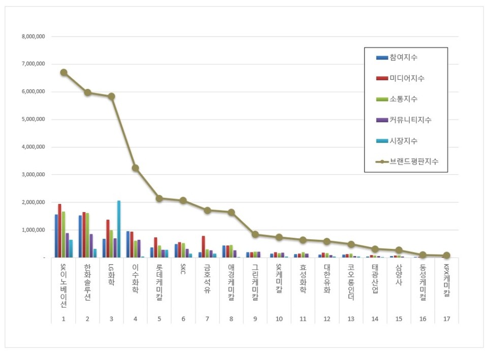 3위, LG화학 브랜드는 참여지수 693,056 미디어지수 1,367,894 소통지수 995,594 커뮤니티지수 709,390 시장지수 2,069,848이 되면서 브랜드평판지수 5,835,781로 분석됐다. 지난 3월 브랜드평판지수 4,115,250과 비교해보면 41.81% 상승했다.