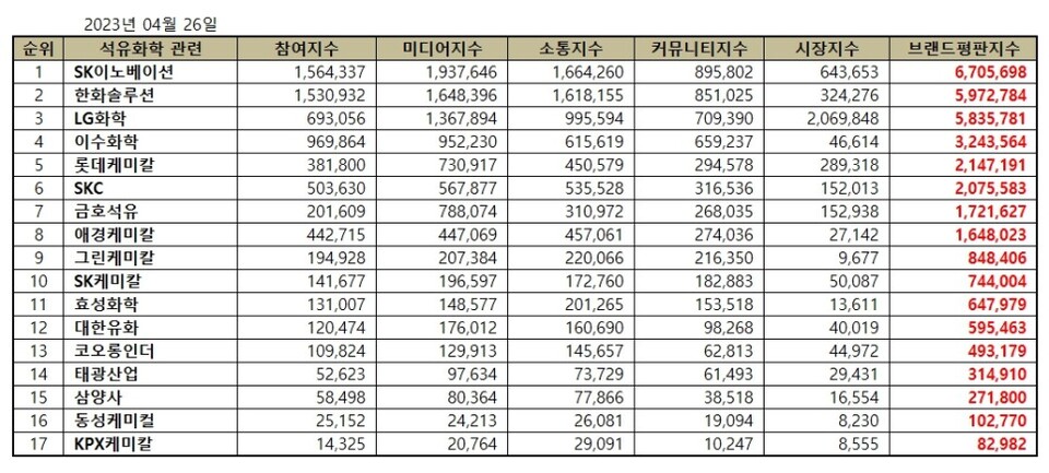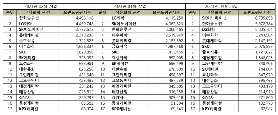 석유화학 관련 상장기업 브랜드평판 2023년 4월 빅데이터 분석 순위는 SK이노베이션, 한화솔루션, LG화학, 이수화학, 롯데케미칼, SKC, 금호석유, 애경케미칼, 그린케미칼, SK케미칼, 효성화학, 대한유화, 코오롱인더, 태광산업, 삼양사, 동성케미컬, KPX케미칼 순이었다.