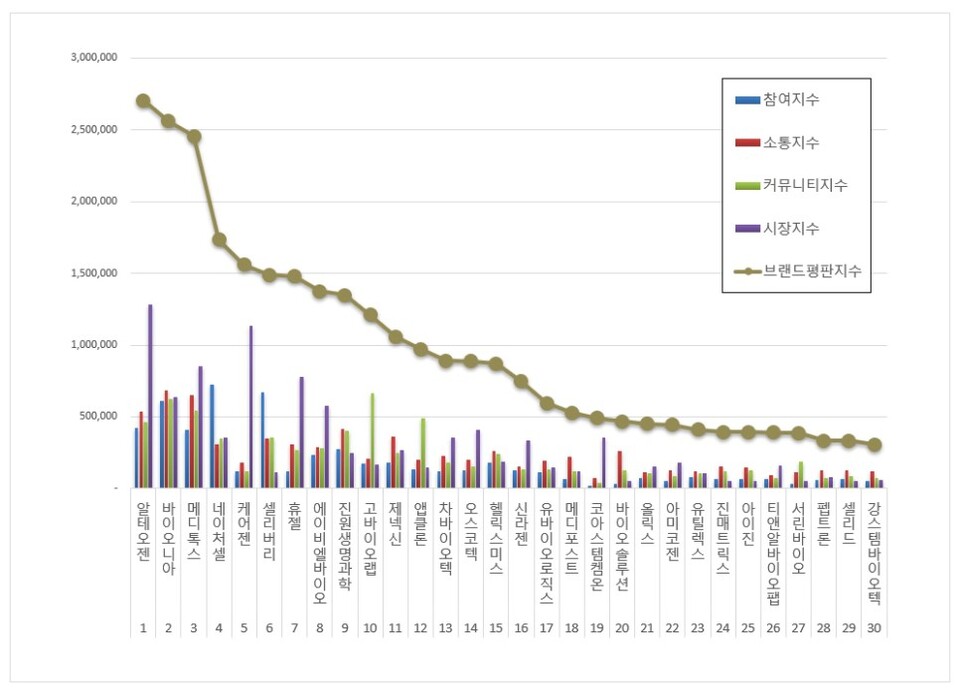 생물공학 상장기업 브랜드평판 분석은 참여지수, 소통지수, 커뮤니티지수, 시장지수로 구분하여 브랜드평판지수를 산출했다.