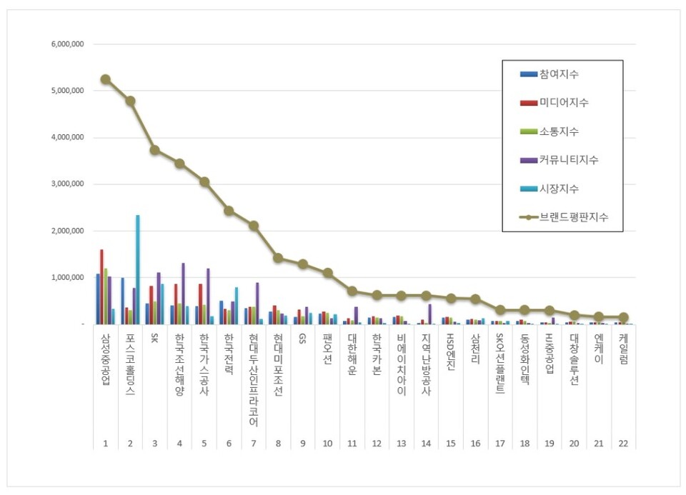 1위, 삼성중공업 브랜드는 참여지수 1,086,645 미디어지수 1,611,593 소통지수 1,194,003 커뮤니티지수 1,032,065 시장지수 331,522가 되면서 브랜드평판지수 5,255,827로 분석됐다. 지난 3월 브랜드평판지수 5,074,368과 비교해보면 3.58% 상승했다.