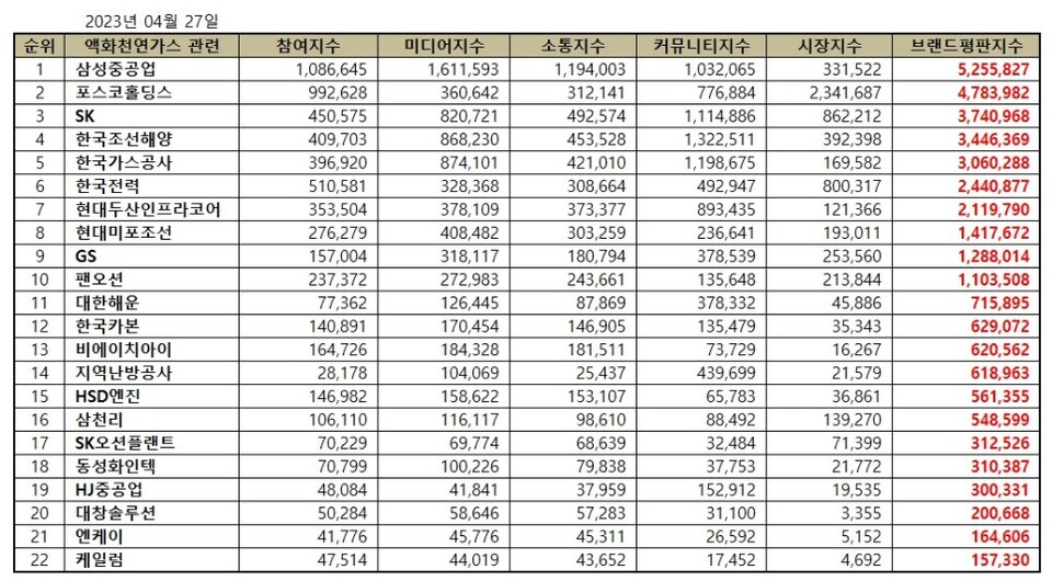 액화천연가스 LNG 관련 상장기업 브랜드평판 2023년 4월 빅데이터 분석 순위는 삼성중공업, 포스코홀딩스, SK, 한국조선해양, 한국가스공사, 한국전력, 현대두산인프라코어, 현대미포조선, GS, 팬오션, 대한해운, 한국카본, 비에이치아이, 지역난방공사, HSD엔진, 삼천리, SK오션플랜트, 동성화인텍, HJ중공업, 대창솔루션, 엔케이, 케일럼 순이었다.