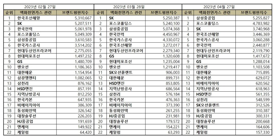 이넷뉴스 에너지 톱 브랜드위원회는 27일 액화천연가스 LNG 관련 상장기업 ‘2023년 4월 빅데이터 분석결과’를 발표했다. 발표에 따르면, 1위 삼성중공업 2위 포스코홀딩스 3위 SK 순으로 나타났다.