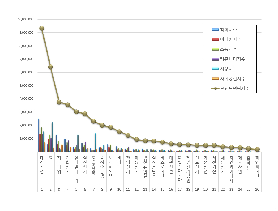 1위, 대한전선 브랜드는 참여지수 2,502,640 미디어지수 1,353,057 소통지수 1,860,428 커뮤니티지수 1,335,267 시장지수 1,540,260 사회공헌지수 736,736이 되면서 브랜드평판지수 9,328,389로 분석됐다. 지난 3월 브랜드평판지수 11,695,193과 비교해보면 20.24% 하락했다.