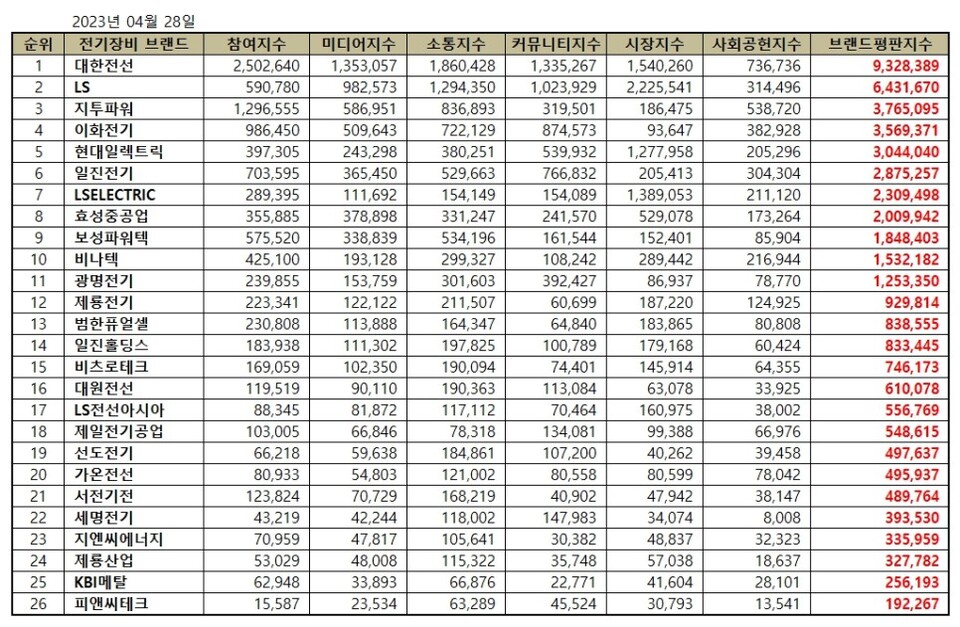 - [e브랜드평판] 대한전선, 전기장비 브랜드평판 1위···LS·현대일렉트릭 상위권
