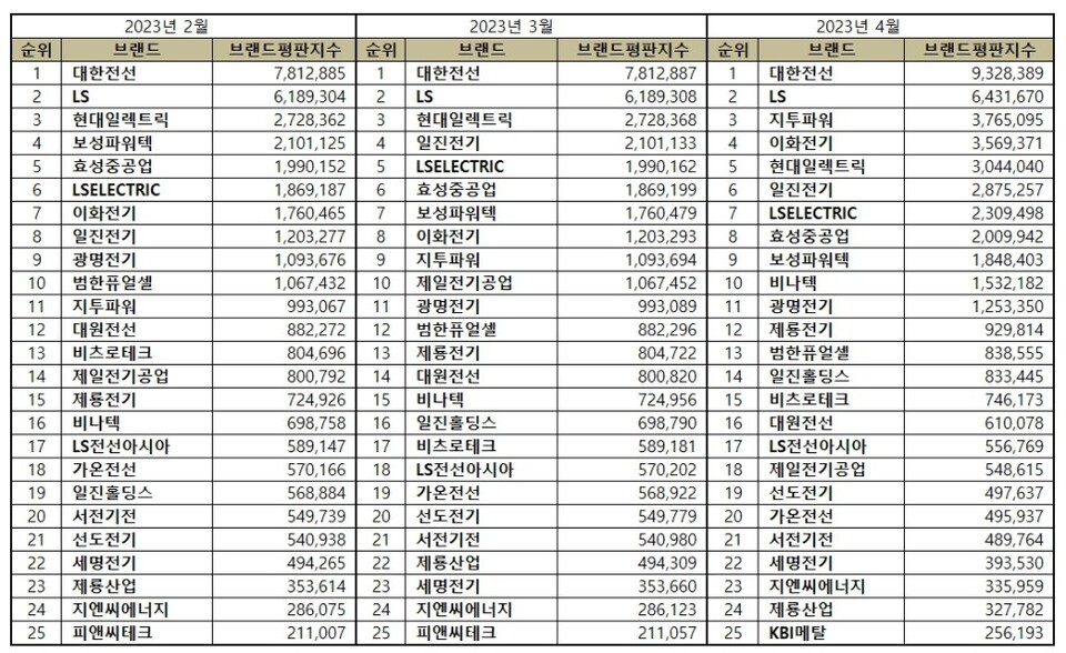이넷뉴스 에너지 톱 브랜드위원회는 28일 전기장비 관련 상장기업 ‘2023년 4월 빅데이터 분석결과’를 발표했다. 발표에 따르면, 1위 대한전선 2위 LS 3위 지투파워 순으로 나타났다.