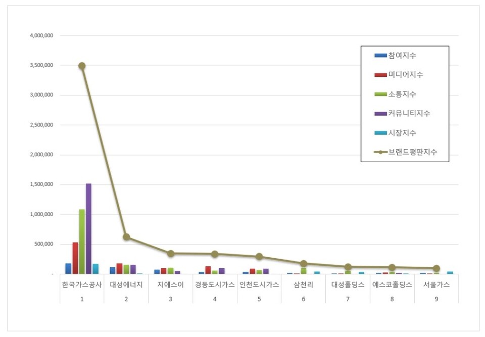 1위, 한국가스공사 브랜드는 참여지수 182,494 미디어지수 536,169 소통지수 1,090,704 커뮤니티지수 1,517,214 시장지수 172,657이 되면서 브랜드평판지수 3,499,238로 분석됐다. 지난 4월 브랜드평판지수 3,491,330과 비교해보면 0.23% 상승했다.