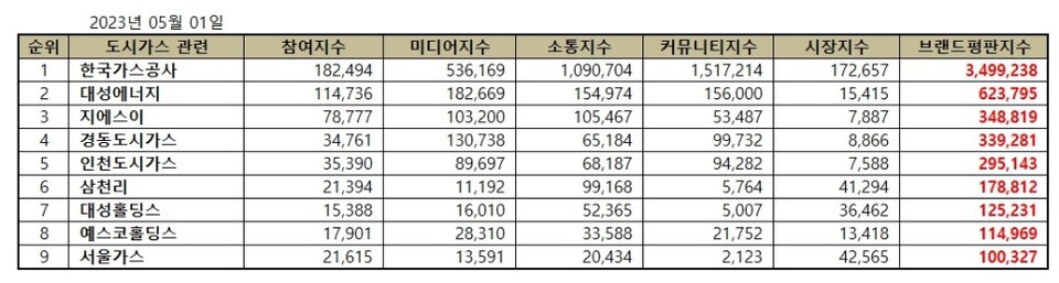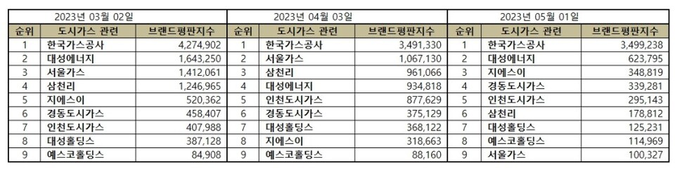 이넷뉴스 = 2023년 5월 도시가스 상장기업 브랜드평판이 공개됐다.